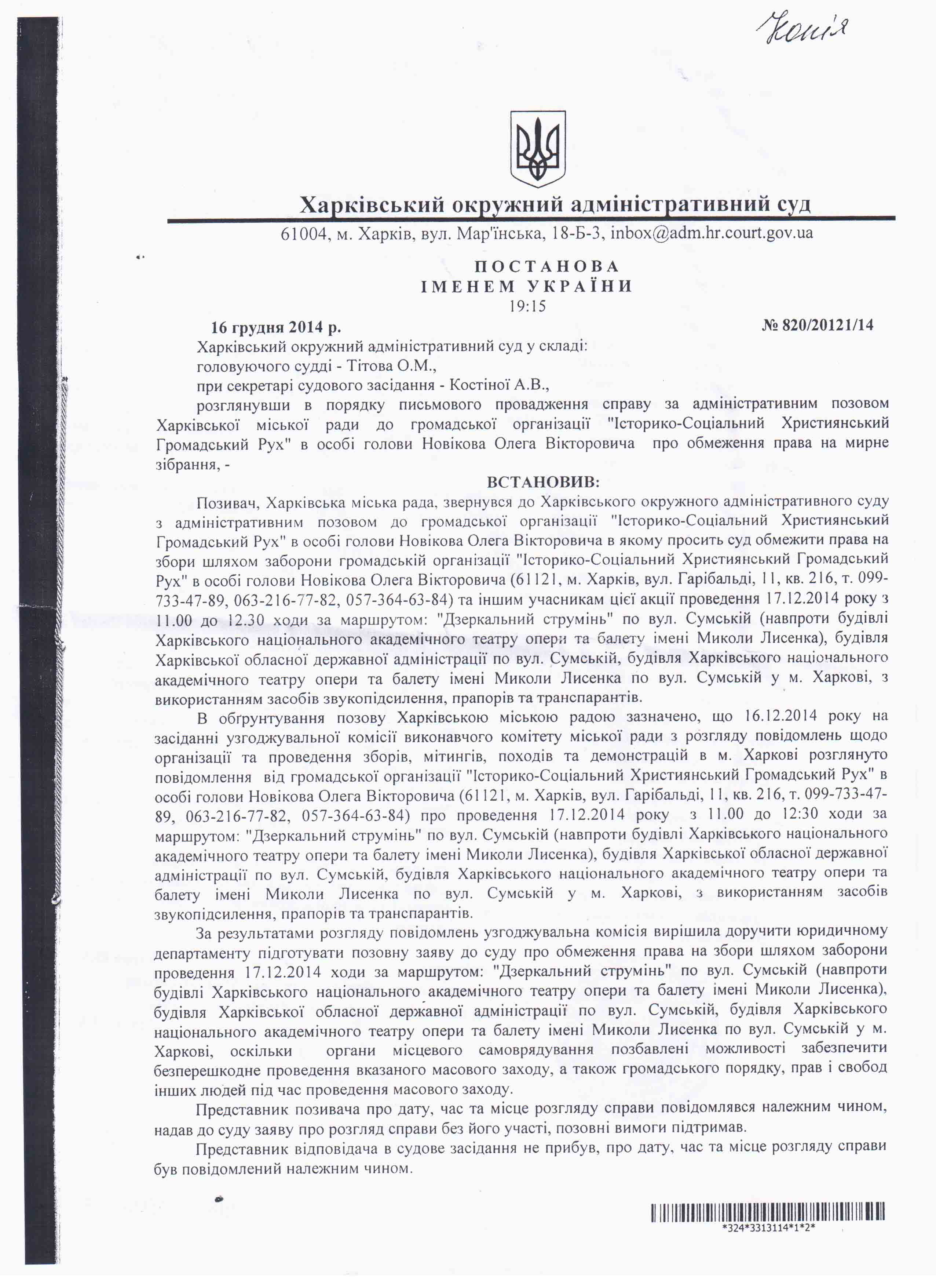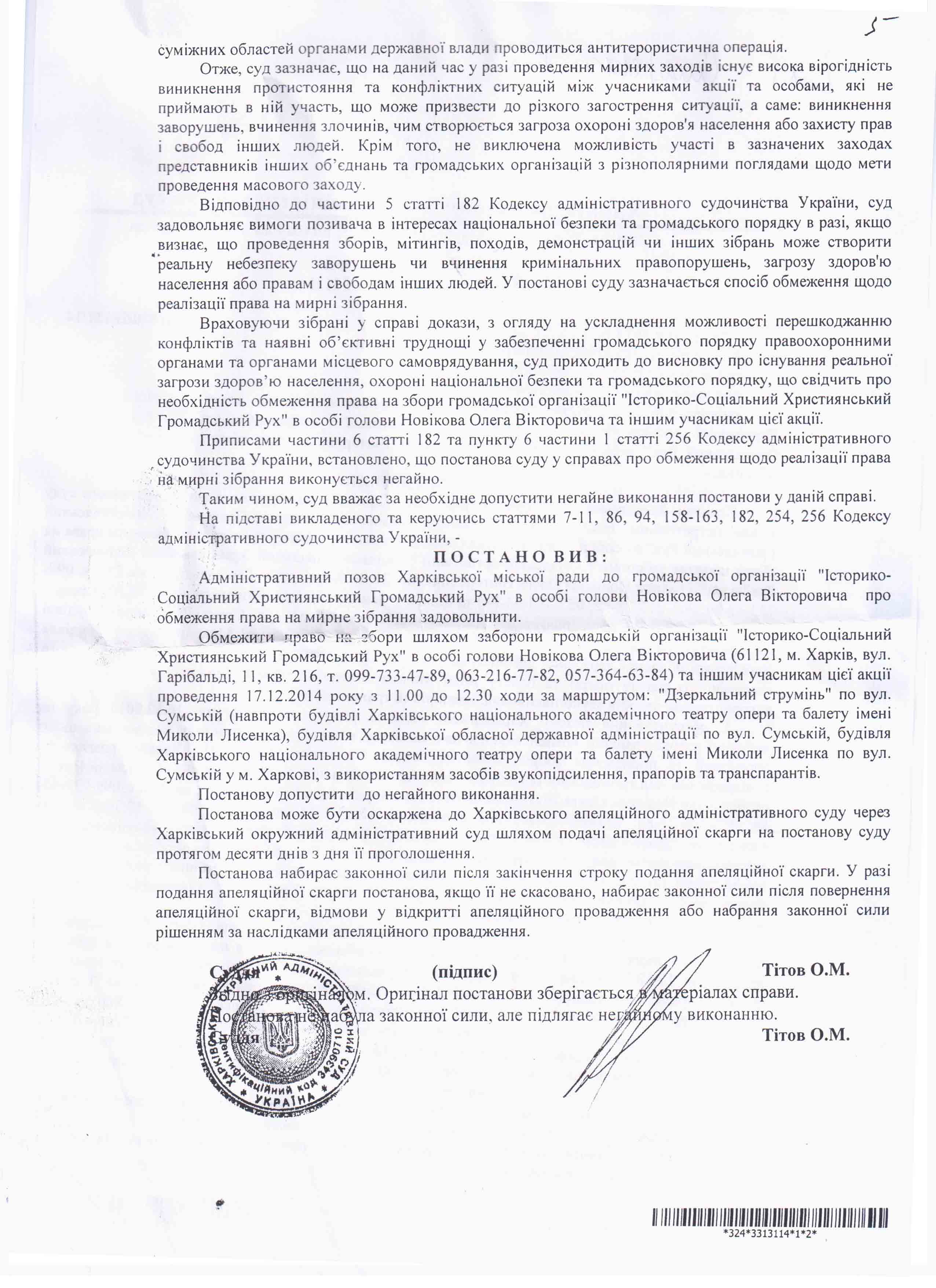 «Обмежити право на збори шляхом заборони громадській організації «Історико-соціальний християнський громадський рух» в особі голови Олега Новікова та іншим учасникам цієї акції проведення 17 грудня 2014 року з 11:00 до 12:30 ходи за маршрутом: «Дзеркальний струмінь» по вул. Сумській (навпроти будівлі ХНАТОБу), будівля Харківської облдержадміністрації по вул. Сумській, будівля ХНАТОБу по вул. Сумській у місті Харкові, з використанням засобів звукопідсилення, прапорів і транспарантів», - сказано в ухвалі суду.